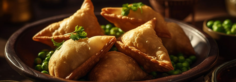 Las samosas son un tipo de snack o aperitivo muy popular en la cocina india y otros países del sur de Asia. Se trata de una especie de pan (parecido al pan pita), con la diferencia de que se conoce por su forma triangular y su relleno especiado, además de que se fríe.